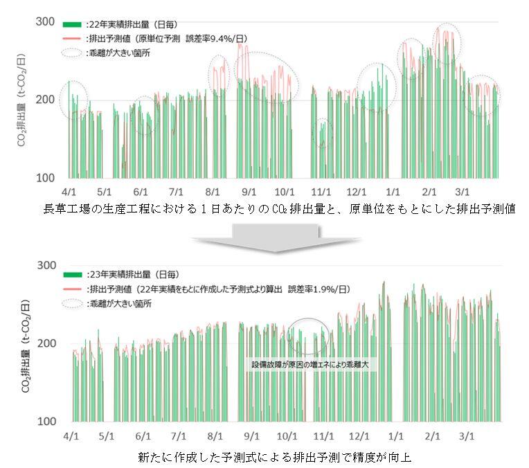 一方、CO2排出量の管理も重要であると認識する中で、生産台数1台あたりの排出原単位をもとに日々の想定排出量を予測・管理したところ、工程やエネルギーごとに変動要因が多岐にわたり、予測と実績で1日あたり平均9.4%の誤差が生じた。このため、日々変動する排出量の妥当性を判断することが難しいという課題があった。そこで各生産条件に応じたCO2排出実績データに対して重回帰分析※1を行い、工程・エネルギーごとに81通りの予測式を作成。気温、湿度、稼働率、生産台数といった生産条件値を入力することでCO2排出予測値を算出可能とした結果、1日当たり平均1.9%の誤差まで予測精度が向上した。